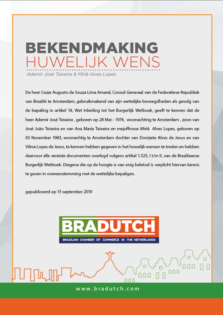 Home HUWELIJK Bekenmaking HUWELIJK Bekenmaking 15th September 2019 263 0 Facebook Twitter Google+ Pinterest WhatsApp Linkedin Email Members & PartnersMembers & Partners ListAir EuropaBradutch Brazilian Chamber of Commerce in the Netherlands - 23rd January 20200Members & Partners ListGran BeefBradutch Brazilian Chamber of Commerce in the Netherlands - 13th August 20190Members & Partners ListMoneytransBradutch Brazilian Chamber of Commerce in the Netherlands - 24th January 20190Members & Partners ListCorendonBradutch Brazilian Chamber of Commerce in the Netherlands - 16th January 20190Members & Partners ListAKD Benelux LawyersBradutch Brazilian Chamber of Commerce in the Netherlands - 30th November 20180Members & Partners ListOffshore EnergyBradutch Brazilian Chamber of Commerce in the Netherlands - 3rd October 20180Members & Partners ListFenix Gems & MineralsBradutch Brazilian Chamber of Commerce in the Netherlands - 26th August 20180Members & Partners ListGringo LanguagesBradutch Brazilian Chamber of Commerce in the Netherlands - 26th August 20180Members & Partners ListDalosBradutch Brazilian Chamber of Commerce in the Netherlands - 3rd May 20180in the NetherlandsIRO, the Association of Dutch Suppliers in the Upstream Oil and Gas Industry and Offshore Renewable Industry,Bradutch Brazilian Chamber of Commerce in the Netherlands - 20th April 20180Members & Partners ListRede DigitalBradutch Brazilian Chamber of Commerce in the Netherlands - 28th March 20180Members & Partners ListRVO – Netherlands Enterprise AgencyBradutch Brazilian Chamber of Commerce in the Netherlands - 28th March 20180Members & Partners ListFast Forward FreightBradutch Brazilian Chamber of Commerce in the Netherlands - 27th March 20180Members & Partners ListMyon B.VBradutch Brazilian Chamber of Commerce in the Netherlands - 27th March 20180Members & Partners ListDamstéBradutch Brazilian Chamber of Commerce in the Netherlands - 27th March 20180Members & Partners ListBrazil ExpandBradutch Brazilian Chamber of Commerce in the Netherlands - 27th March 20180Members & Partners ListAlbuquerque Pinto AdvogadosBradutch Brazilian Chamber of Commerce in the Netherlands - 27th March 20180Members & Partners ListDefentti & Queiroz AdvogadosBradutch Brazilian Chamber of Commerce in the Netherlands - 27th March 20180Members & Partners ListBDO Accountants & AdvisorsBradutch Brazilian Chamber of Commerce in the Netherlands - 24th January 20180Members & Partners ListRabobankBradutch Brazilian Chamber of Commerce in the Netherlands - 19th October 20170Members & Partners ListNfiaBradutch Brazilian Chamber of Commerce in the Netherlands - 19th October 20170Members & Partners ListPartnersBradutch Brazilian Chamber of Commerce in the Netherlands - 15th April 20160Members & Partners ListMol NotariaatBradutch Brazilian Chamber of Commerce in the Netherlands - 16th February 20160Members & Partners ListRussell AdvocatenBradutch Brazilian Chamber of Commerce in the Netherlands - 24th November 20150Members & Partners ListDO BRASIL GroupBradutch Brazilian Chamber of Commerce in the Netherlands - 17th November 20150 REGISTER