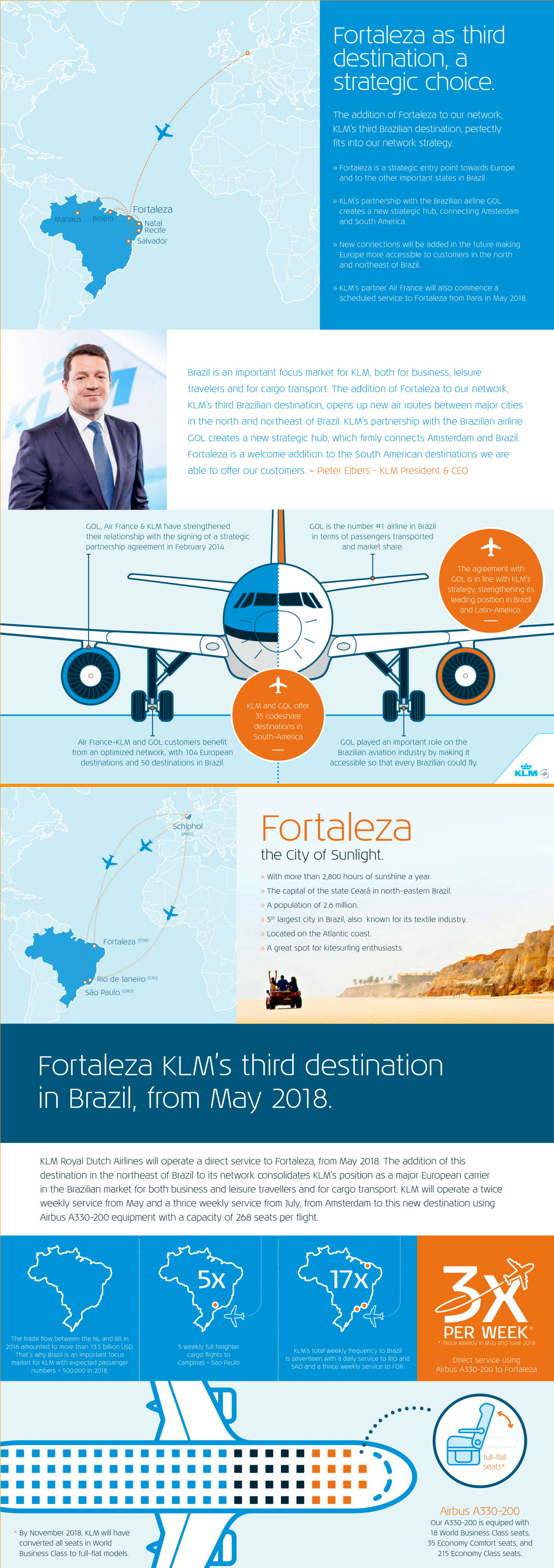 Fortaleza was chosen as KLM’s third destination partly due to the cooperative relationship already in place with Brazilian carrier GOL. GOL’s strategic location, economic and tourist development, and new air links to major cities in northern and north-eastern Brazil make Fortaleza an attractive destination for KLM. KLM’s partner Air France will also be operating flights from Paris to Fortaleza as of today.