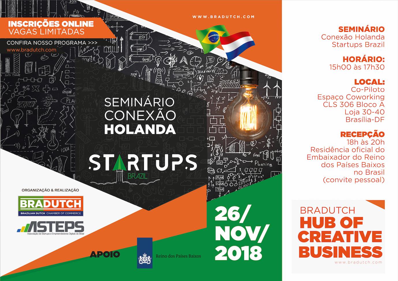 O evento irá marcar o lançamento do projeto Startups Brazil, realizado como resultado de uma parceria entre a Bradutch e a ASTEPS – Associação de Startups e Empreendedores Digitais do Brasil, que tem como objetivo principal promover a cooperação mútua e as relações de negócios e investimentos entre o Brasil e os Países Baixos na área de startups e empresas digitais. Este seminário deve ser o primeiro de muitos a serem realizados pela Bradutch e seus parceiros em todo o Brasil.